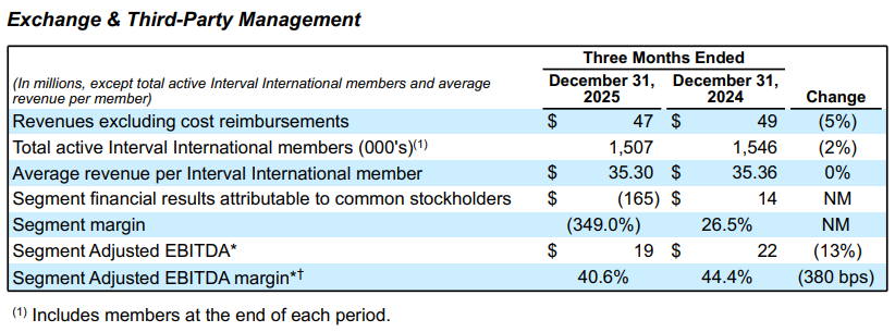 Revenues excluding cost reimbursements and Segment Adjusted EBITDA decreased year-over-year due to lower exchange and Getaway revenue at Interval International.
